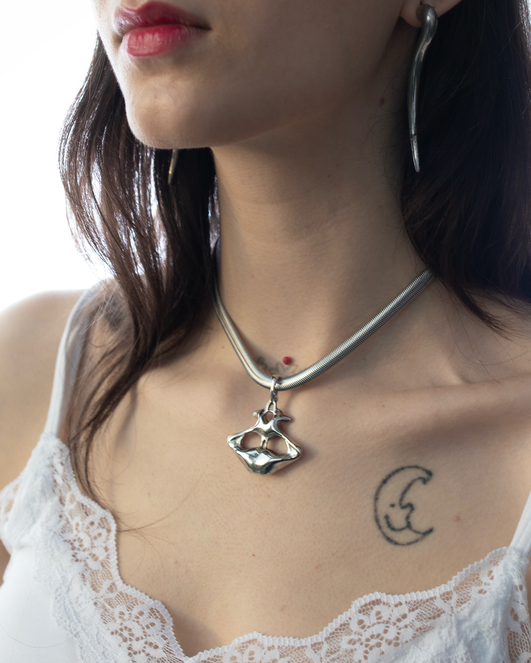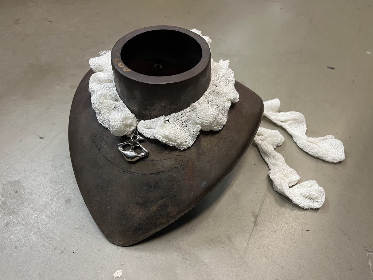 Clavice Pendant by Agoston Balazs. Handmade knitted scarf made from viscose and wool blend yarn by. Eszter Kain